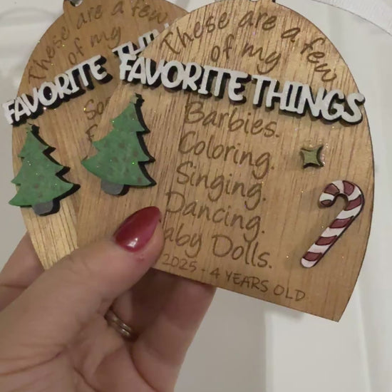 Introducing our Children Favorite Things Memory Ornament! This wooden ornament can be customized with your child's 5 favorite things, with name and age. The perfect keepsake for your little one and a great addition to your holiday decorations. Measures at 3.5 inches. Add a personal touch to your tree this year!